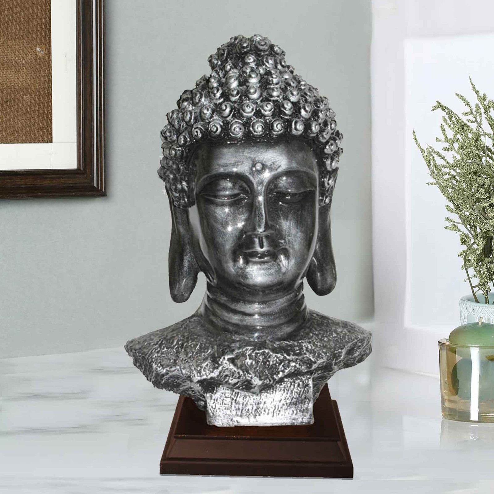 Buddha Bust artifacts for living room Silver Antique Finish with Wooden Base 44 cm G57GW1063SSAGX