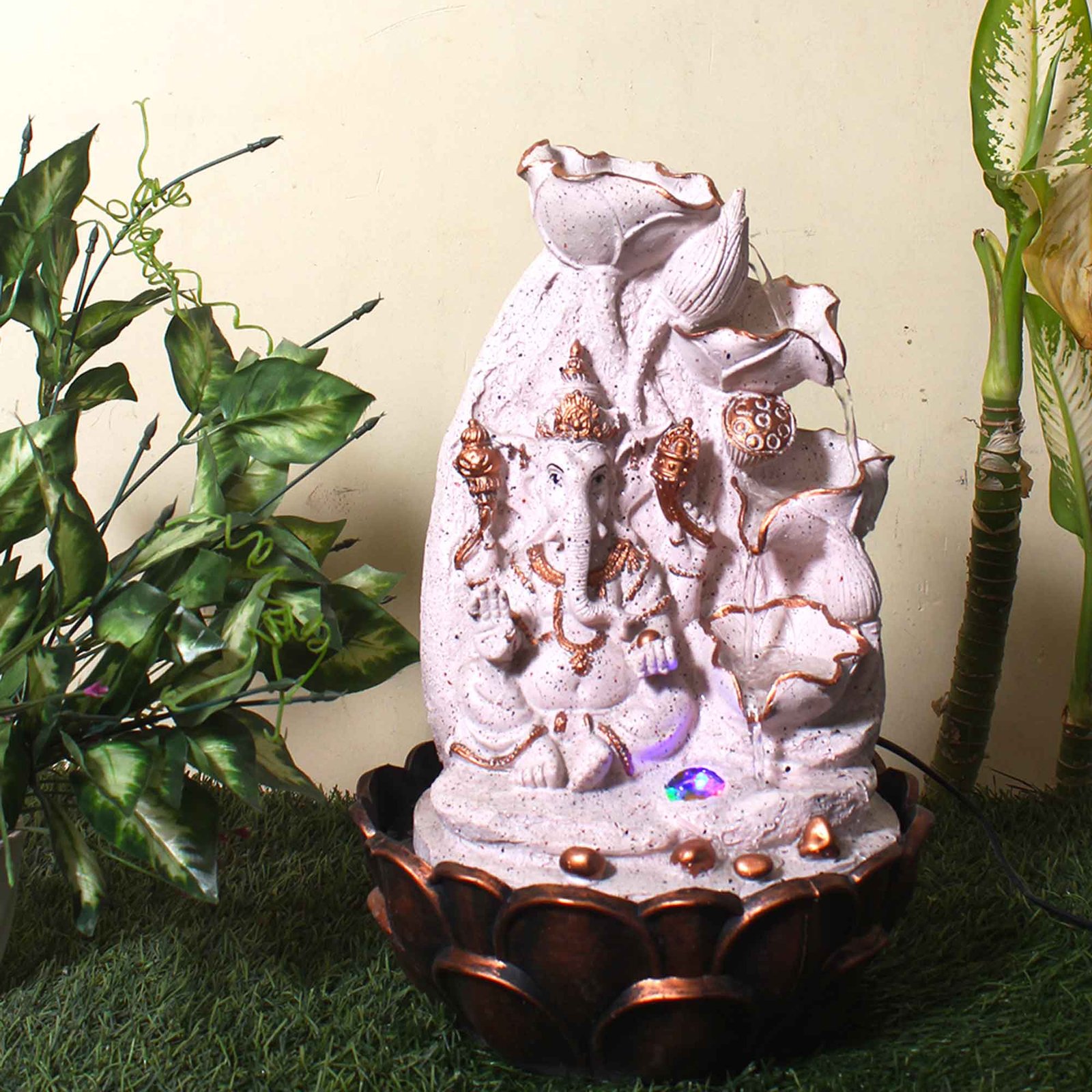 Lord Ganesha with Floral Shaped small size water fountain With Led Light - sands...
