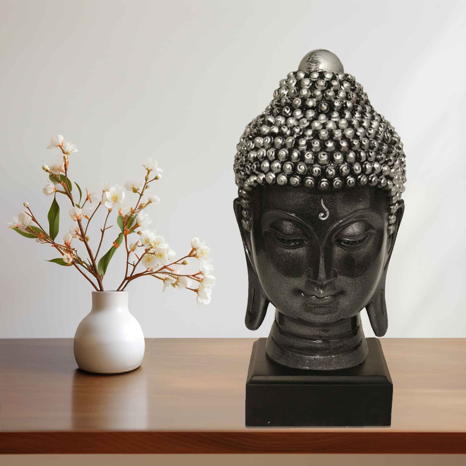 Gautam Buddha Face artifacts for home decor Silver Antique Finish with Wooden Base 24 cm G57GW1062SSAGX