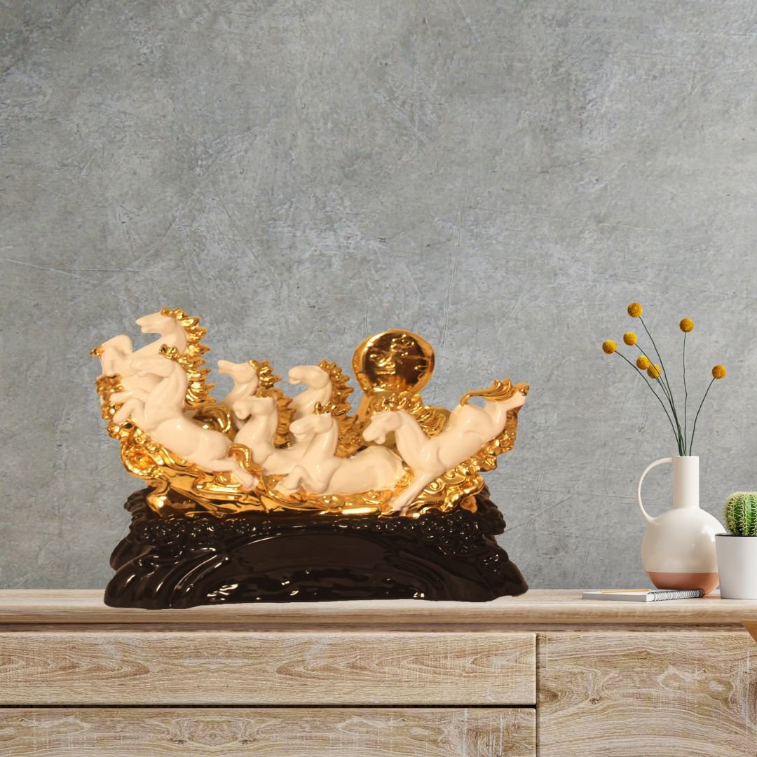 Make in India Gold Plated Seven Horse is made by professional artisans using high quality row material. Great look with unfadable color. Showpiece direct from factory at wholesale price This Showpiece is easily cleanable by wet/Dry Cotton Cloth.
