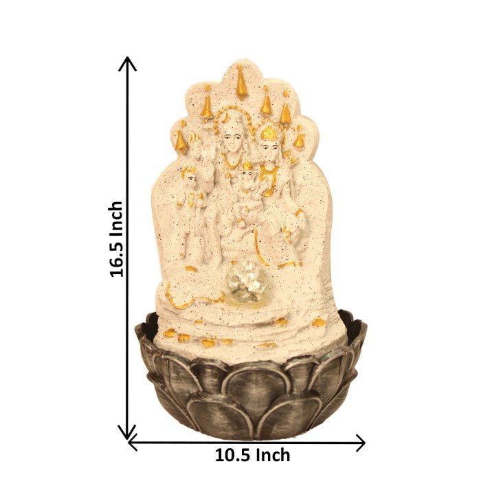 Lord Shiva Parivar Tabletop indoor water fountain is a beautiful showpiece for home decor. This indoor water fountain not only looks great but also brings positivity to your space. Sound effect of water fountain helps create a positive and harmonious environment. As a home decorative water fountain, it adds a touch of elegance and peace to your living space. This Lord Shiv Parivaar Indoor water fountain also makes for a wonderful decorative gift item for home decoration, ideal for housewarmings or special occasions. An indoor water fountain is best decoration and thoughtful gift. Whether placed in a living room, home, office, showroom, restaurant, hotel and wedding hall, the gentle sound of flowing water can enhance the beauty of area. As a gift, an indoor water fountain is not only visually appealing but also symbolizes harmony and balance. Water fountain is best ideal decorative gift choice as birthday, housewarming, office / shop inauguration, New Year, Wedding, Corporate Diwali gifts or any occasion.