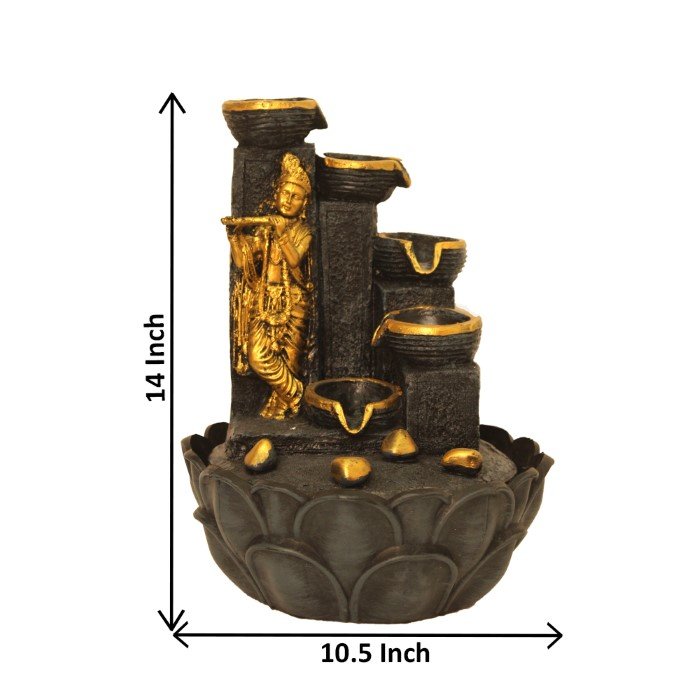 Lord Krishna indoor water fountain is a beautiful showpiece for home decor. This indoor water fountain not only looks great but also brings positivity to your space. Sound effect of water fountain helps create a positive and harmonious environment. As a home decorative water fountain, it adds a touch of elegance and peace to your living space. This Lord Krishna also makes for a wonderful decorative gift item for home decoration, ideal for housewarmings or special occasions. An indoor water fountain is best decoration and thoughtful gift. Whether placed in a living room, home, office, showroom, restaurant, hotel and wedding hall, the gentle sound of flowing water can enhance the beauty of area. As a gift, an indoor water fountain is not only visually appealing but also symbolizes harmony and balance. Water fountain is best ideal decorative gift choice as birthday, housewarming, office / shop inauguration, New Year, Wedding, Corporate Diwali gifts or any occasion.