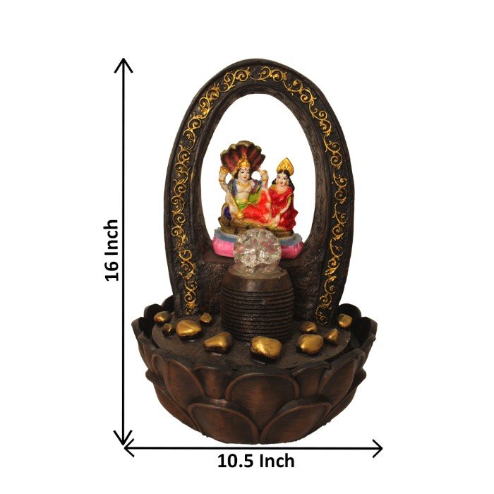 Vishnu Laxmi indoor water fountain is a beautiful showpiece for home decor. This indoor water fountain not only looks great but also brings positivity to your space. Sound effect of water fountain helps create a positive and harmonious environment. As a home decorative water fountain, it adds a touch of elegance and peace to your living space. This Vishnu Laxmi indoor water fountain with crystal ball also makes for a wonderful decorative gift item for home decoration, ideal for housewarmings or special occasions. An indoor water fountain is best decoration and thoughtful gift. Whether placed in a living room, home, office, showroom, restaurant, hotel and wedding hall, the gentle sound of flowing water can enhance the beauty of area. As a gift, an indoor water fountain is not only visually appealing but also symbolizes harmony and balance. Water fountain is best ideal decorative gift choice as birthday, housewarming, office / shop inauguration, New Year, Wedding, Corporate Diwali gifts or any occasion.