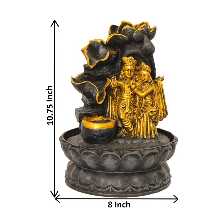 Lord Radha Krishna indoor water fountain is a beautiful showpiece for home decor. This beautiful Radha Krishna water fountain not only looks great but also brings positivity to your space. Sound effect of water fountain helps create a positive and harmonious environment. As a home decorative water fountain, it adds a touch of elegance and peace to your living space. This Lord Radha Krishna also makes for a wonderful decorative gift item for home decoration, ideal for housewarmings or special occasions. An indoor water fountain is best decoration and thoughtful gift. Whether placed in a living room, home, office, showroom, restaurant, hotel and wedding hall, the gentle sound of flowing water can enhance the beauty of area. As a gift, an indoor water fountain is not only visually appealing but also symbolizes harmony and balance. Water fountain is best ideal decorative gift choice as birthday, housewarming, office / shop inauguration, New Year, Wedding, Corporate Diwali gifts or any occasion.