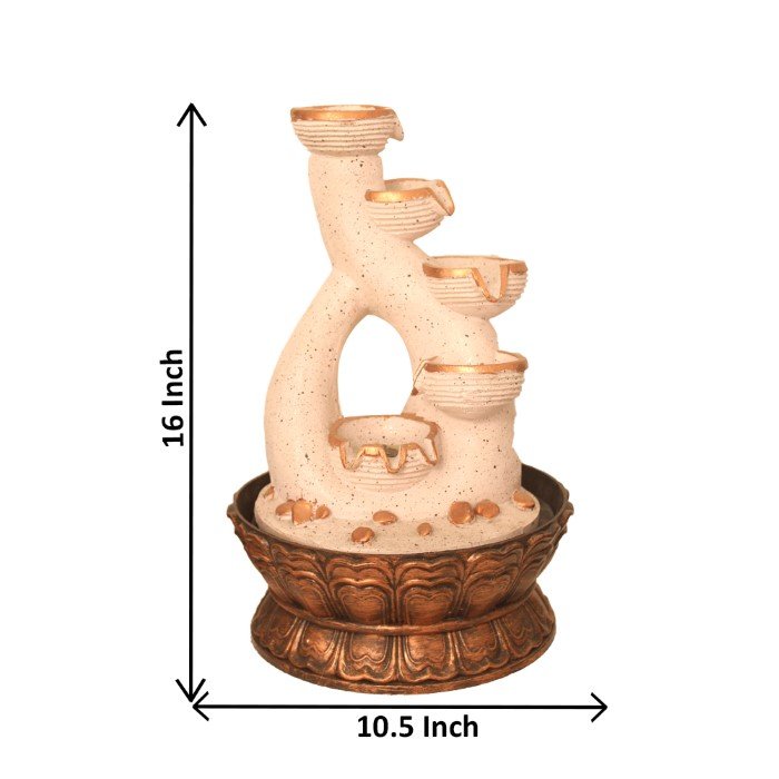 5 steps Decorative Diya indoor water fountain is a beautiful showpiece for home decor. This indoor water fountain not only looks great but also brings positivity to your space. Sound effect of water fountain helps create a positive and harmonious environment. As a home decorative water fountain, it adds a touch of elegance and peace to your living space. This Decorative Diya also makes for a wonderful decorative gift item for home decoration, ideal for housewarmings or special occasions. An indoor water fountain is best decoration and thoughtful gift. Whether placed in a living room, home, office, showroom, restaurant, hotel and wedding hall, the gentle sound of flowing water can enhance the beauty of area. As a gift, an indoor water fountain is not only visually appealing but also symbolizes harmony and balance. Water fountain is best ideal decorative gift choice as birthday, housewarming, office / shop inauguration, New Year, Wedding, Corporate Diwali gifts or any occasion.