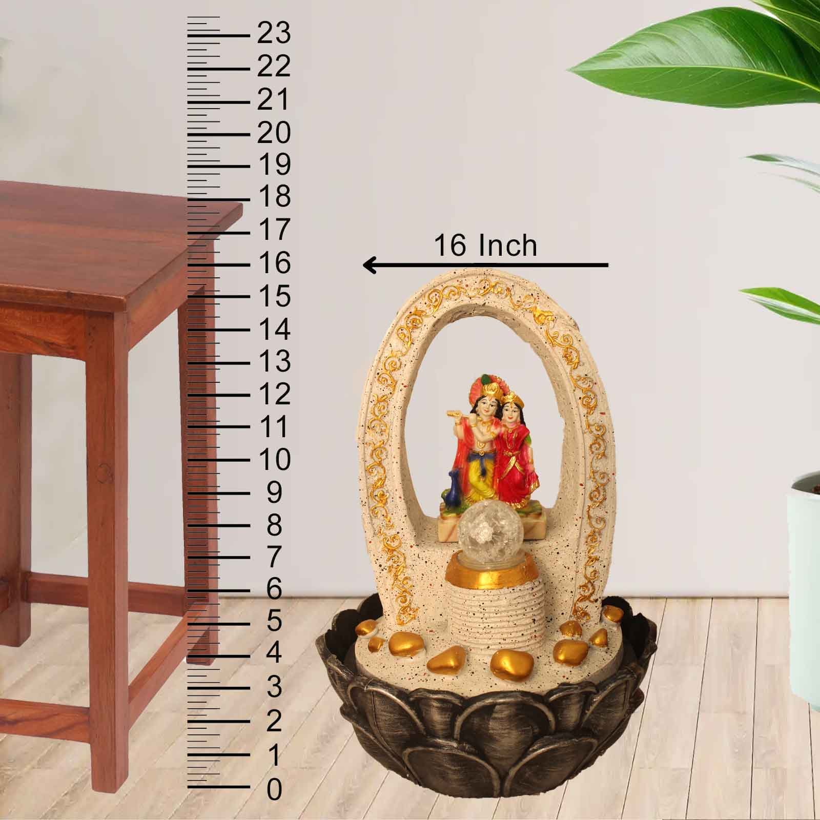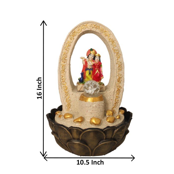 Radha Krishna indoor water fountain is a beautiful showpiece for home decor. This indoor water fountain not only looks great but also brings positivity to your space. Sound effect of water fountain helps create a positive and harmonious environment. As a home decorative water fountain, it adds a touch of elegance and peace to your living space. This Radha Krishna indoor water fountain with crystal ball also makes for a wonderful decorative gift item for home decoration, ideal for housewarmings or special occasions. An indoor water fountain is best decoration and thoughtful gift. Whether placed in a living room, home, office, showroom, restaurant, hotel and wedding hall, the gentle sound of flowing water can enhance the beauty of area. As a gift, an indoor water fountain is not only visually appealing but also symbolizes harmony and balance. Water fountain is best ideal decorative gift choice as birthday, housewarming, office / shop inauguration, New Year, Wedding, Corporate Diwali gifts or any occasion.