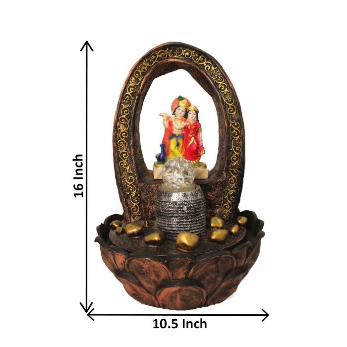 Radha Krishna indoor water fountain is a beautiful showpiece for home decor. This indoor water fountain not only looks great but also brings positivity to your space. Sound effect of water fountain helps create a positive and harmonious environment. As a home decorative water fountain, it adds a touch of elegance and peace to your living space. This Radha Krishna indoor water fountain with crystal ball also makes for a wonderful decorative gift item for home decoration, ideal for housewarmings or special occasions. An indoor water fountain is best decoration and thoughtful gift. Whether placed in a living room, home, office, showroom, restaurant, hotel and wedding hall, the gentle sound of flowing water can enhance the beauty of area. As a gift, an indoor water fountain is not only visually appealing but also symbolizes harmony and balance. Water fountain is best ideal decorative gift choice as birthday, housewarming, office / shop inauguration, New Year, Wedding, Corporate Diwali gifts or any occasion.