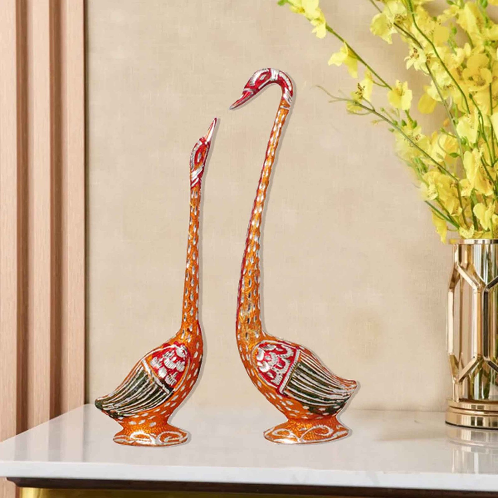 Make in India Swan Pair Gift Article is made by professional artisans using high quality row material. Great look with unfadable color. Showpiece direct from factory at wholesale price This Showpiece is easily cleanable by wet/Dry Cotton Cloth.