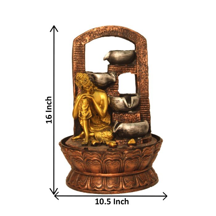 Resting Buddha on knee indoor water fountain is a beautiful showpiece for home decor. This indoor water fountain not only looks great but also brings positivity to your space. Sound effect of water fountain helps create a positive and harmonious environment. As a home decorative water fountain, it adds a touch of elegance and peace to your living space. This Resting Buddha also makes for a wonderful decorative gift item for home decoration, ideal for housewarmings or special occasions. An indoor water fountain is best decoration and thoughtful gift. Whether placed in a living room, home, office, showroom, restaurant, hotel and wedding hall, the gentle sound of flowing water can enhance the beauty of area. As a gift, an indoor water fountain is not only visually appealing but also symbolizes harmony and balance. Water fountain is best ideal decorative gift choice as birthday, housewarming, office / shop inauguration, New Year, Wedding, Corporate Diwali gifts or any occasion.